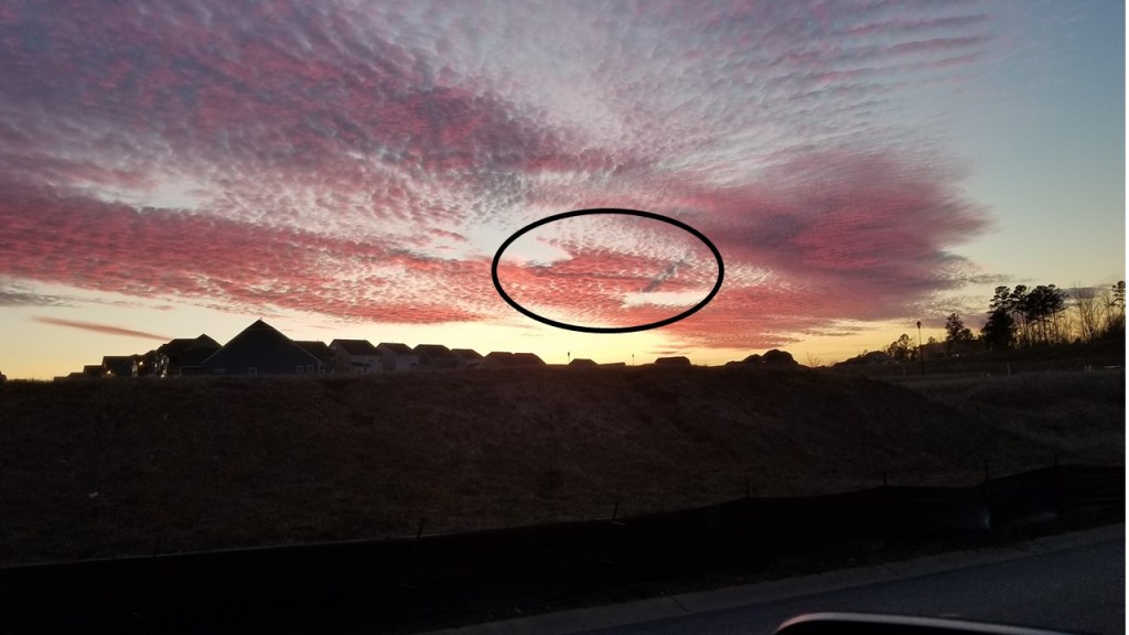 I was admiring the colors, and how they just seemed to be painted in the sky. Then, I hear a voice from behind me. It was my oldest daughter. “God is trying to tell us something!” Puzzled, I asked her why she said that. She then proceeded to point out the cross that is in the clouds.